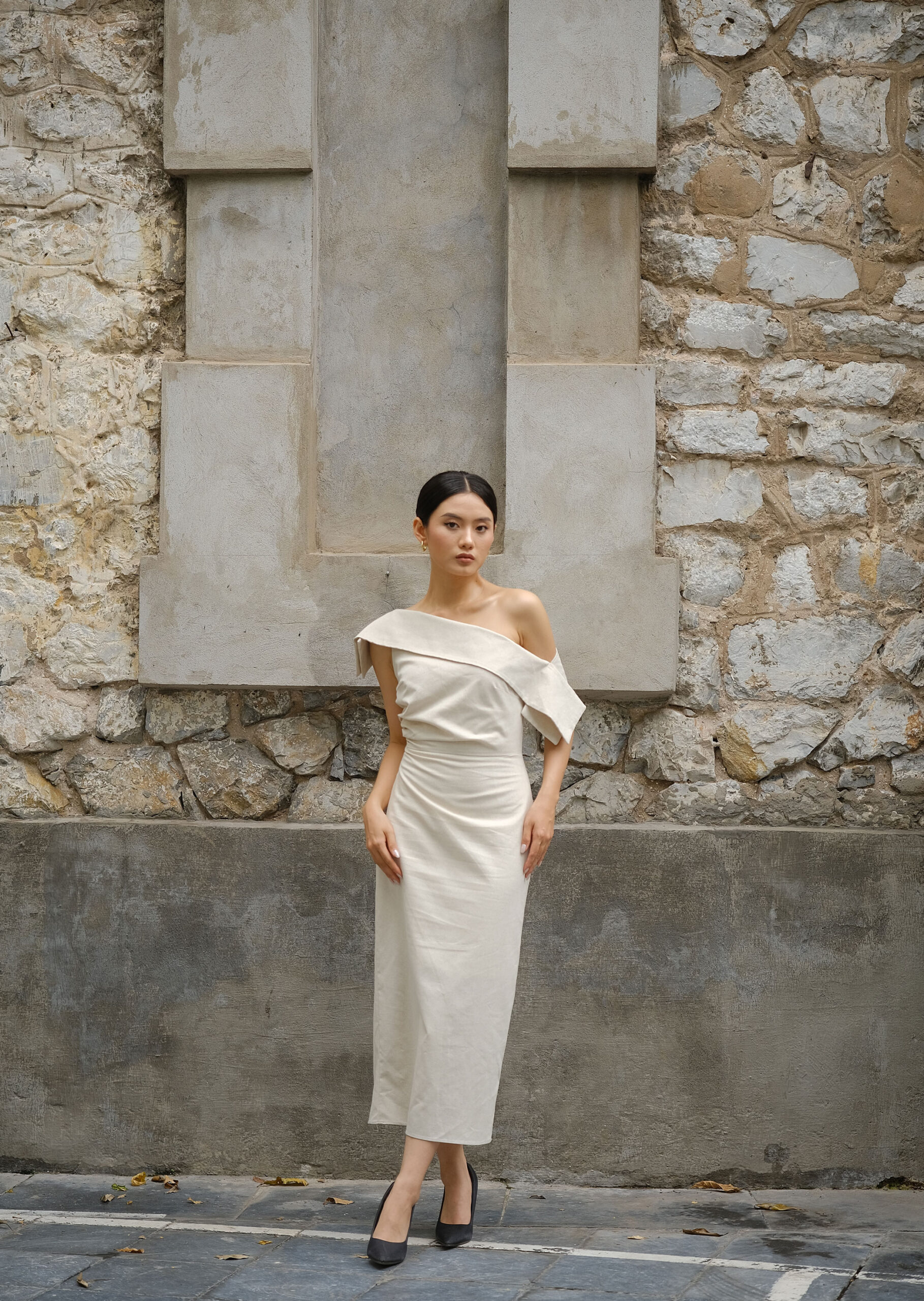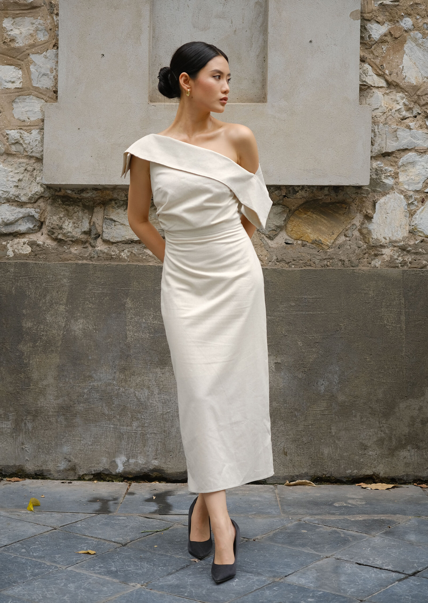Sleek and architectural, this one-shoulder midi dress features a sculptural folded panel that drapes across the neckline and over a single shoulder. A clean, fitted bodice skims into a straight, ankle-grazing skirt for a long, minimalist silhouette.