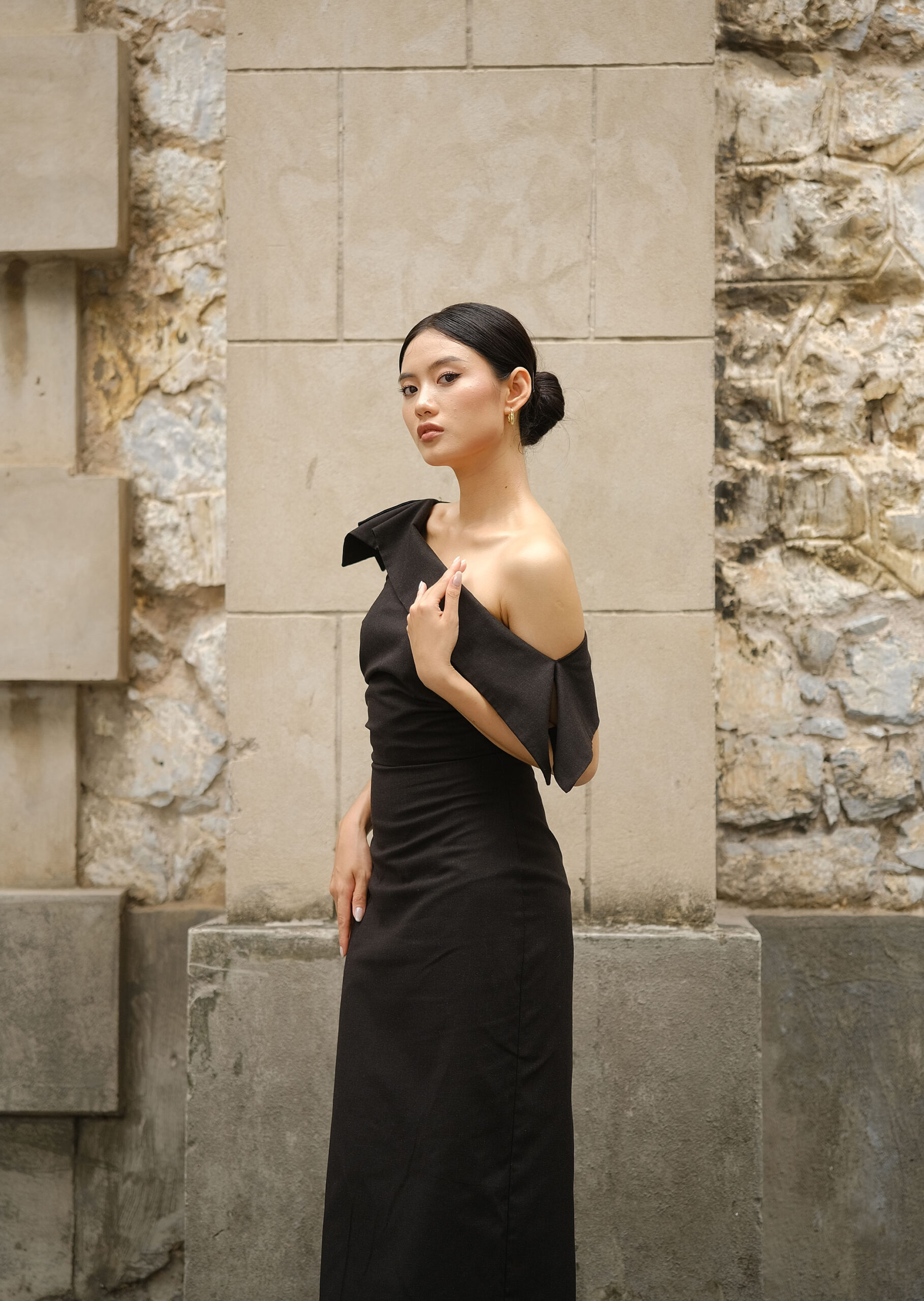 Sleek and architectural, this one-shoulder midi dress features a sculptural folded panel that drapes across the neckline and over a single shoulder. A clean, fitted bodice skims into a straight, ankle-grazing skirt for a long, minimalist silhouette.