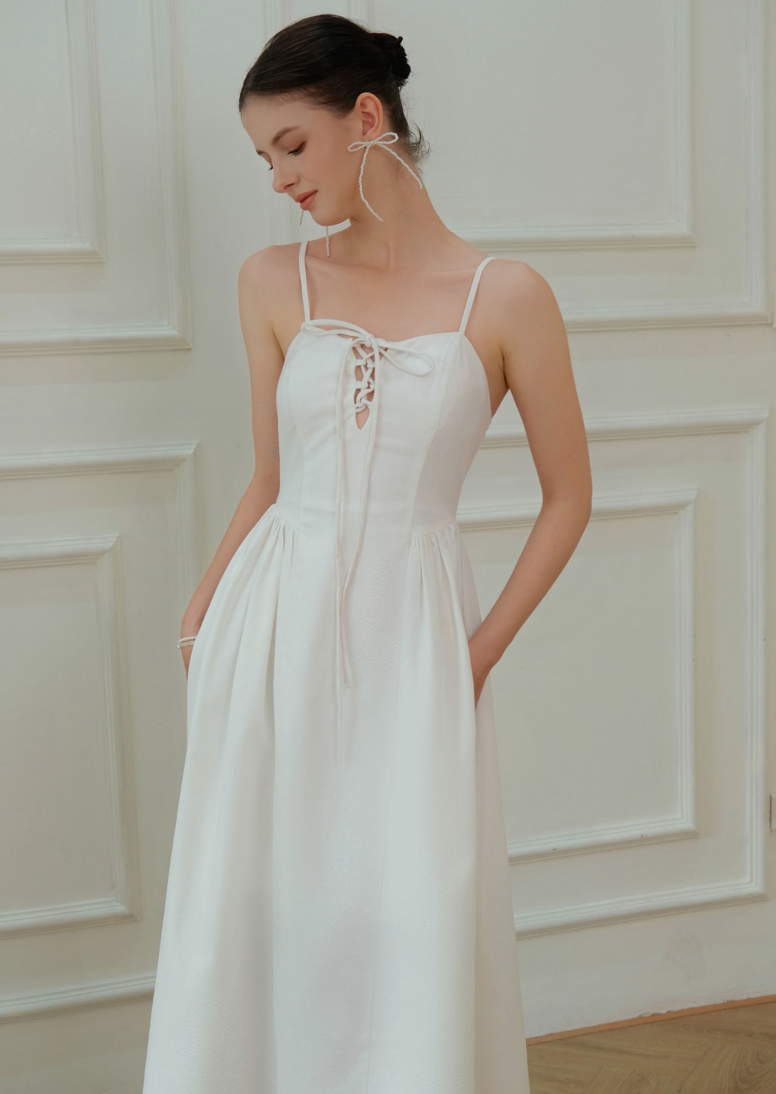 Light and feminine, this midi dress features slender straps and a lace-up front that softly frames the bust. A fitted, panelled bodice falls to a gathered A-line skirt for easy, airy movement from day to evening.