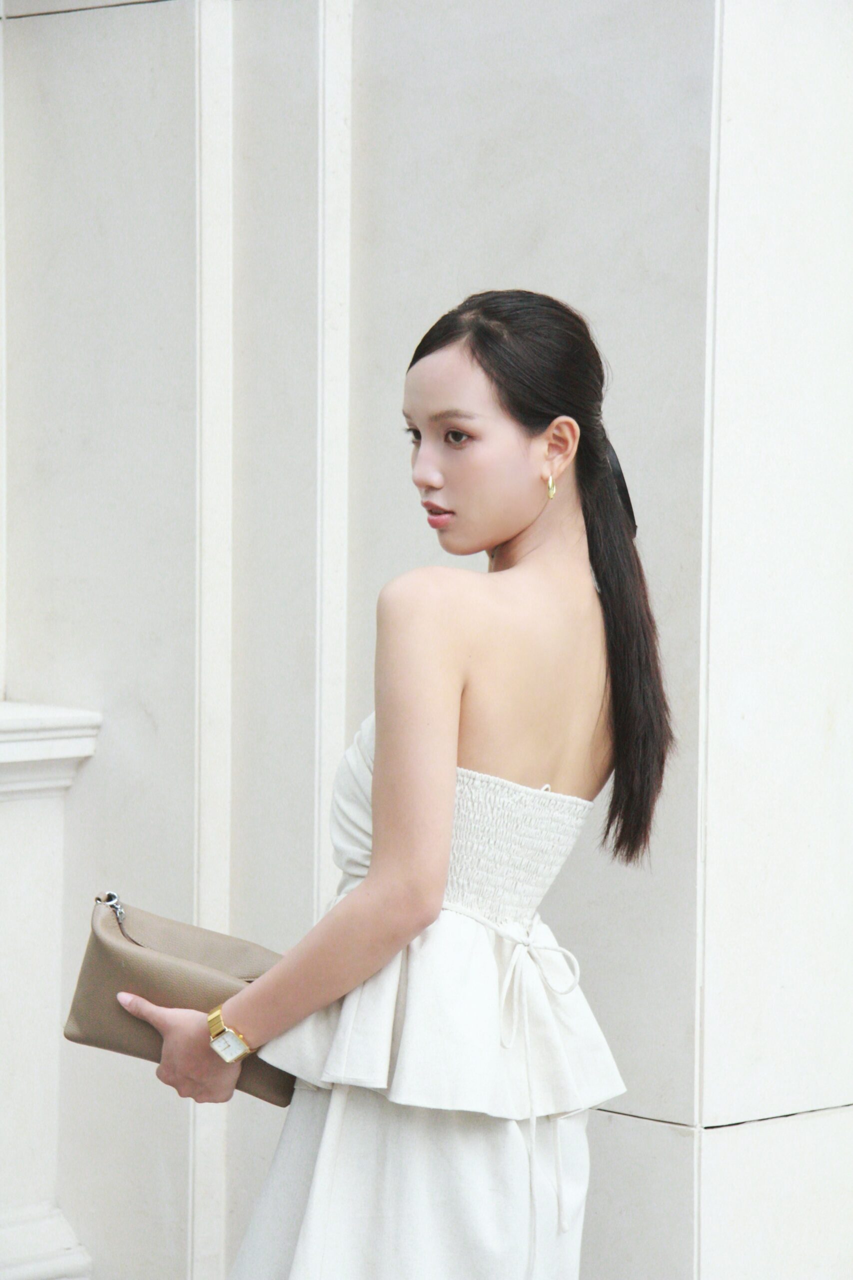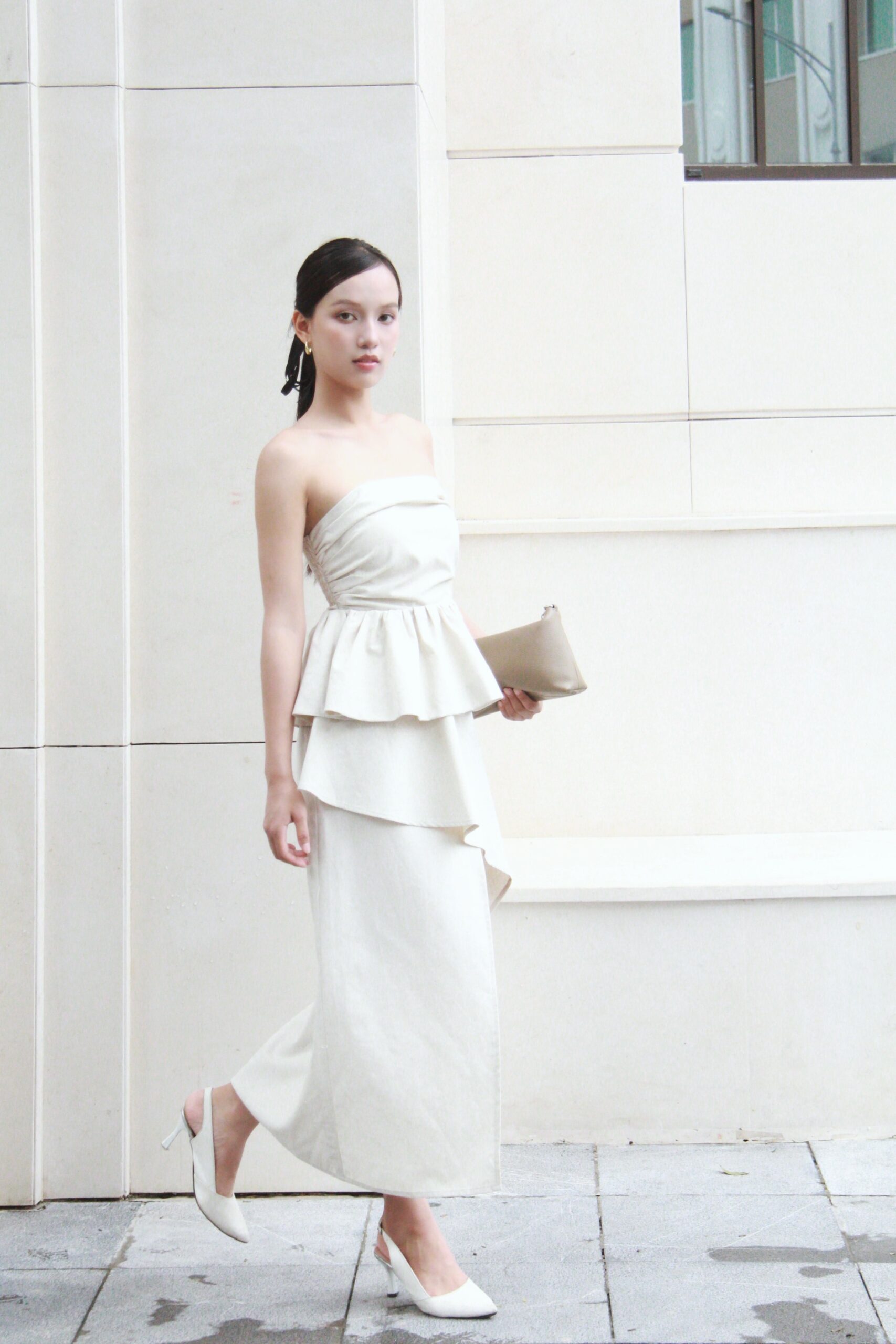 Strapless party dress with a clean, fitted bodice and gentle horizontal pleats across the bust for a softly lifted effect. The waist is finished with a single flared peplum that falls over an asymmetric skirt: shorter in front to show the legs, longer in back for an elegant high–low sweep. Cut in a neutral ivory tone with a lightly matte, structured hand that keeps the peplum crisp—polished yet modern.