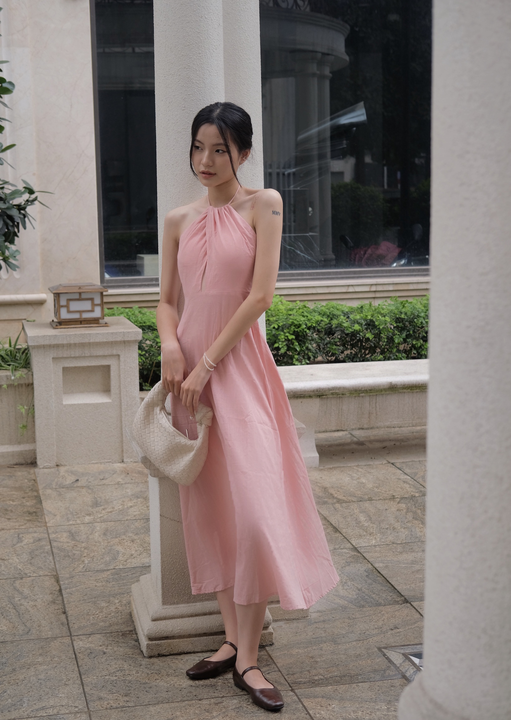 Airy and elegant, this halter maxi dress features a softly gathered neckline that drapes into a fluid, column-to-A silhouette. The back reveals a striking open design with a twisted halter strap, balancing minimal lines with a romantic, breezy feel in softly textured ivory.
