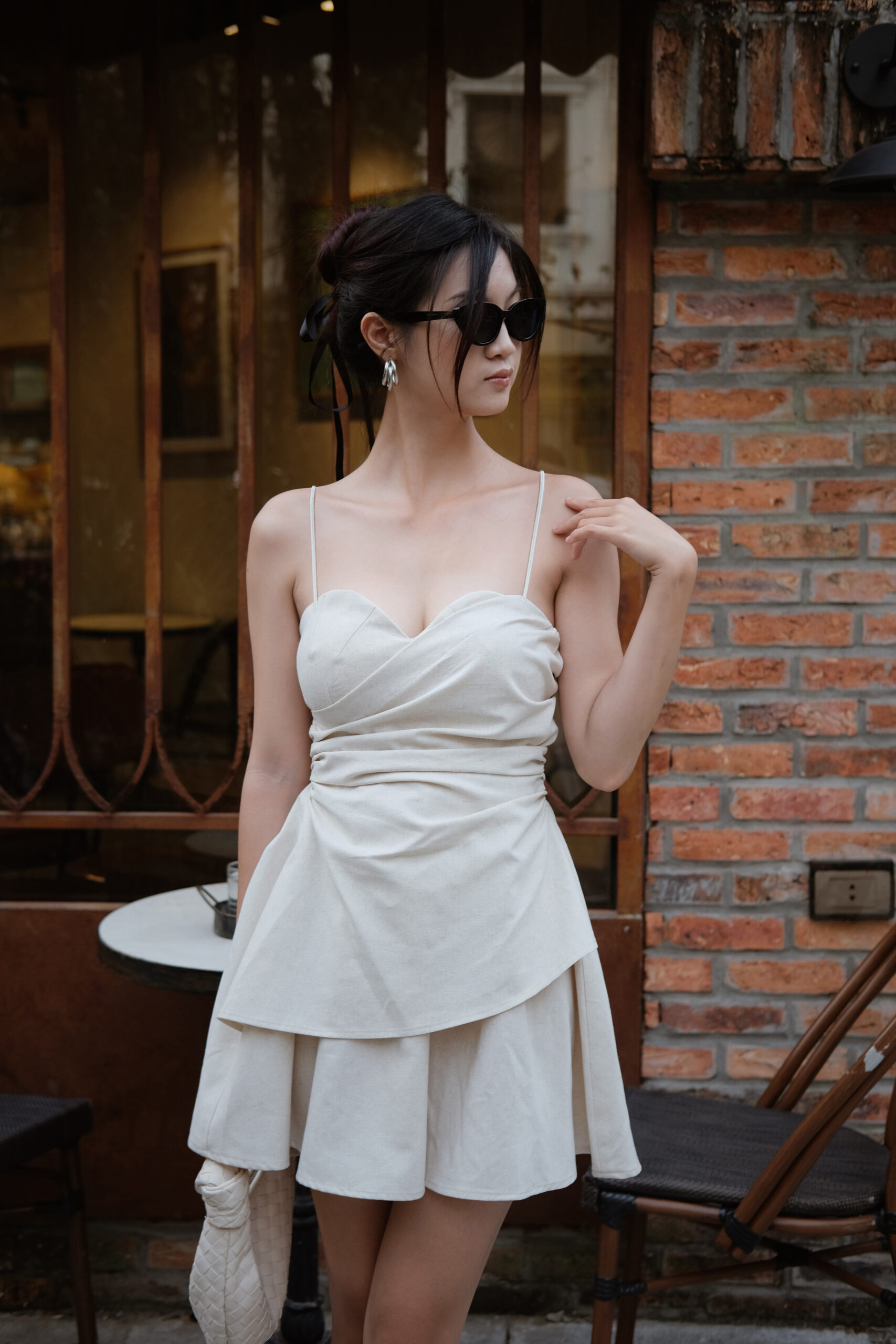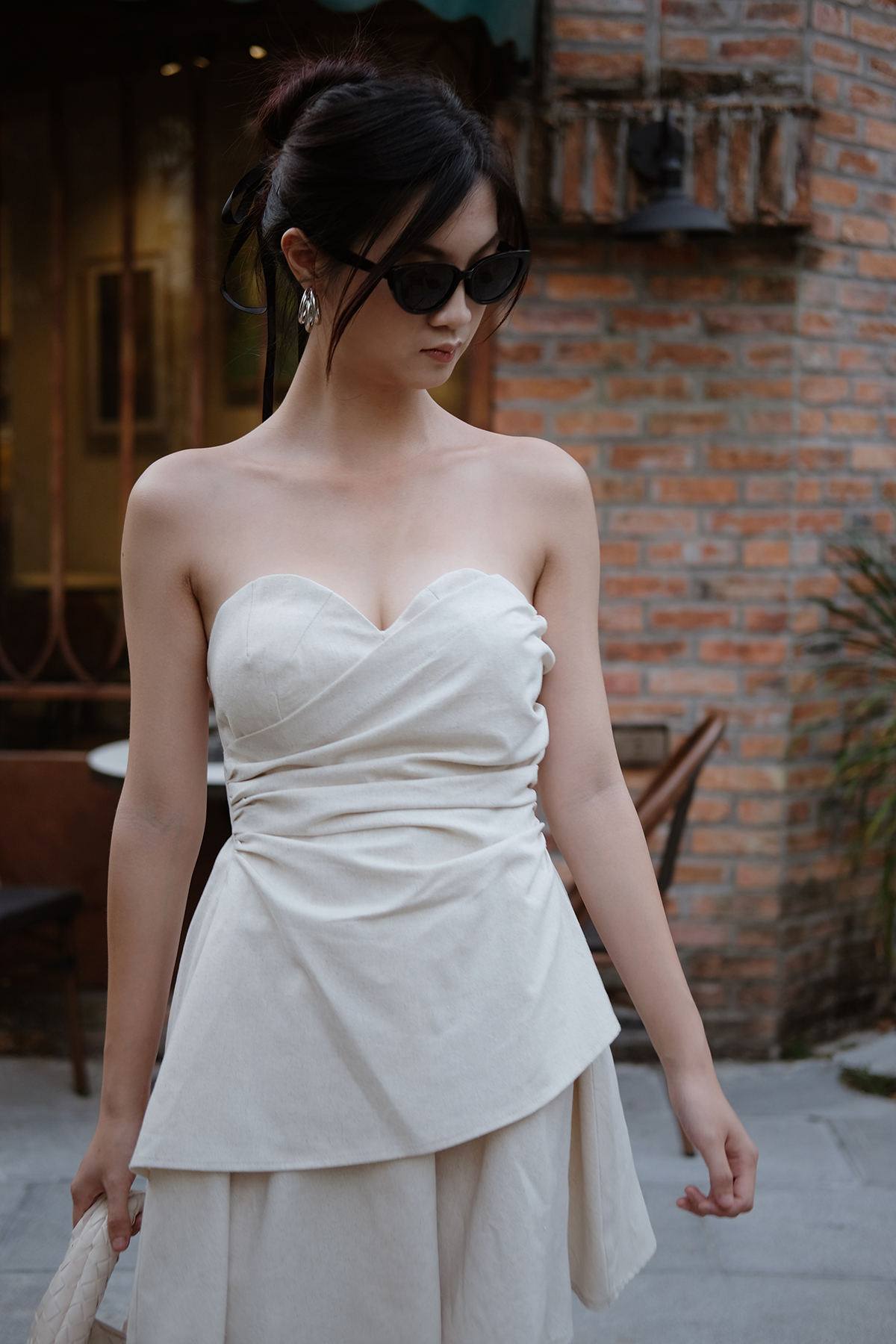 A playful strapless romper with a flirty, two-tier peplum that skims the hips. The bandeau bodice is softly ruched for shape and held in place by a wide smocked back, while the mini shorts peek out beneath the layered hem for a leg-lengthening look. Effortless, feminine, and ready for day-to-night styling.