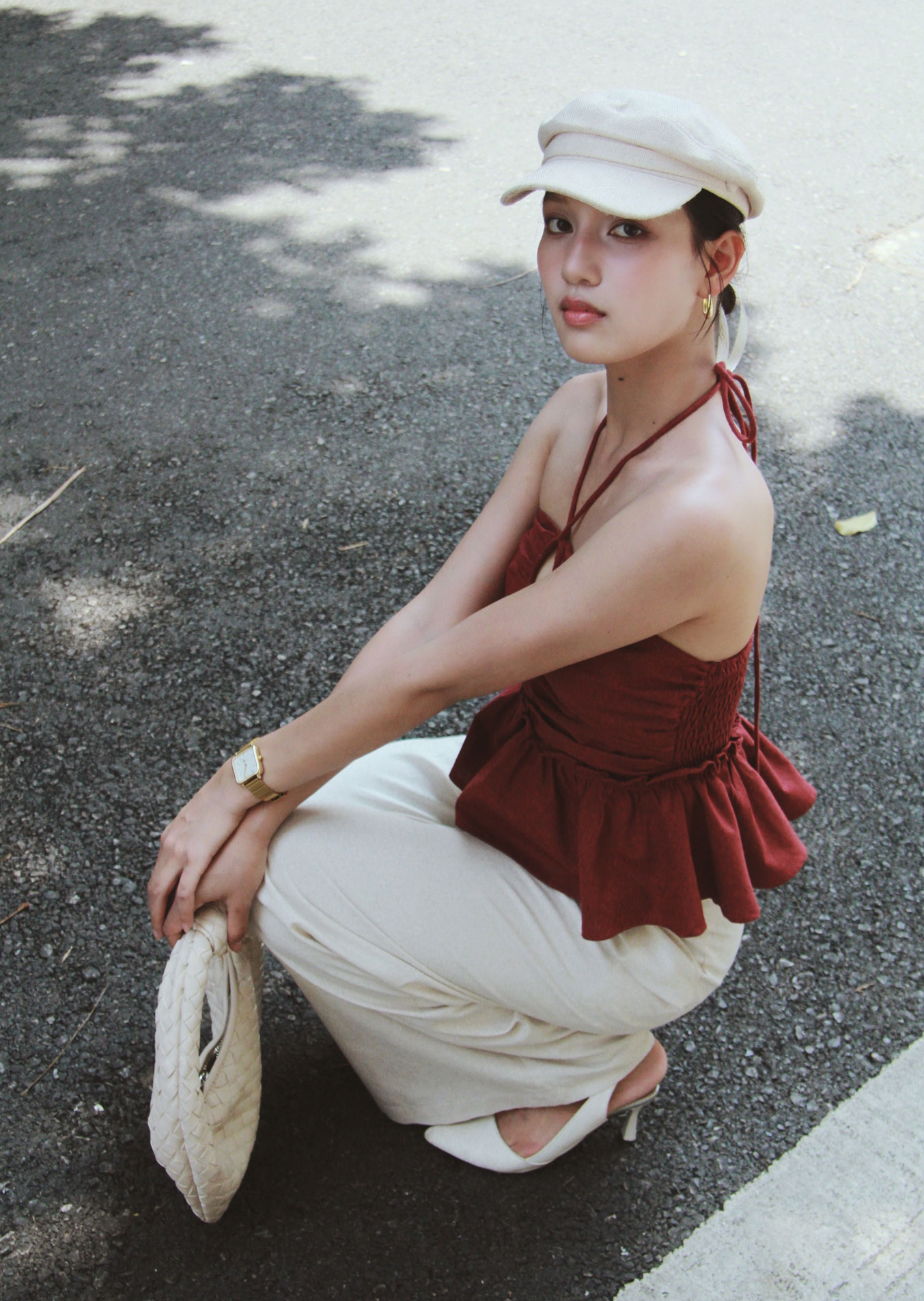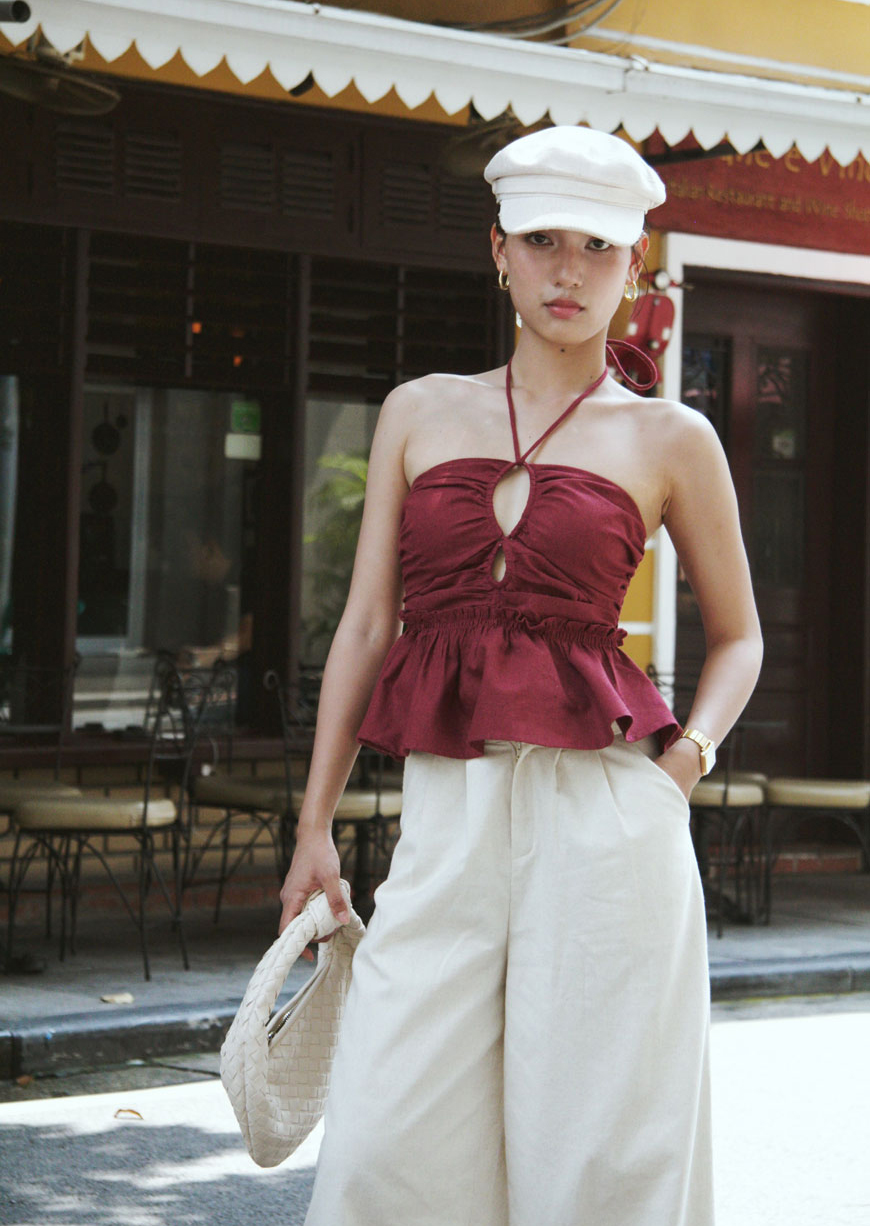 Playful and flattering, this halter peplum top features a softly ruched bodice with twin keyhole cut-outs that highlight the neckline. Cinched at the waist and finished with a flounced hem, it brings easy, feminine movement to warm-weather looks.