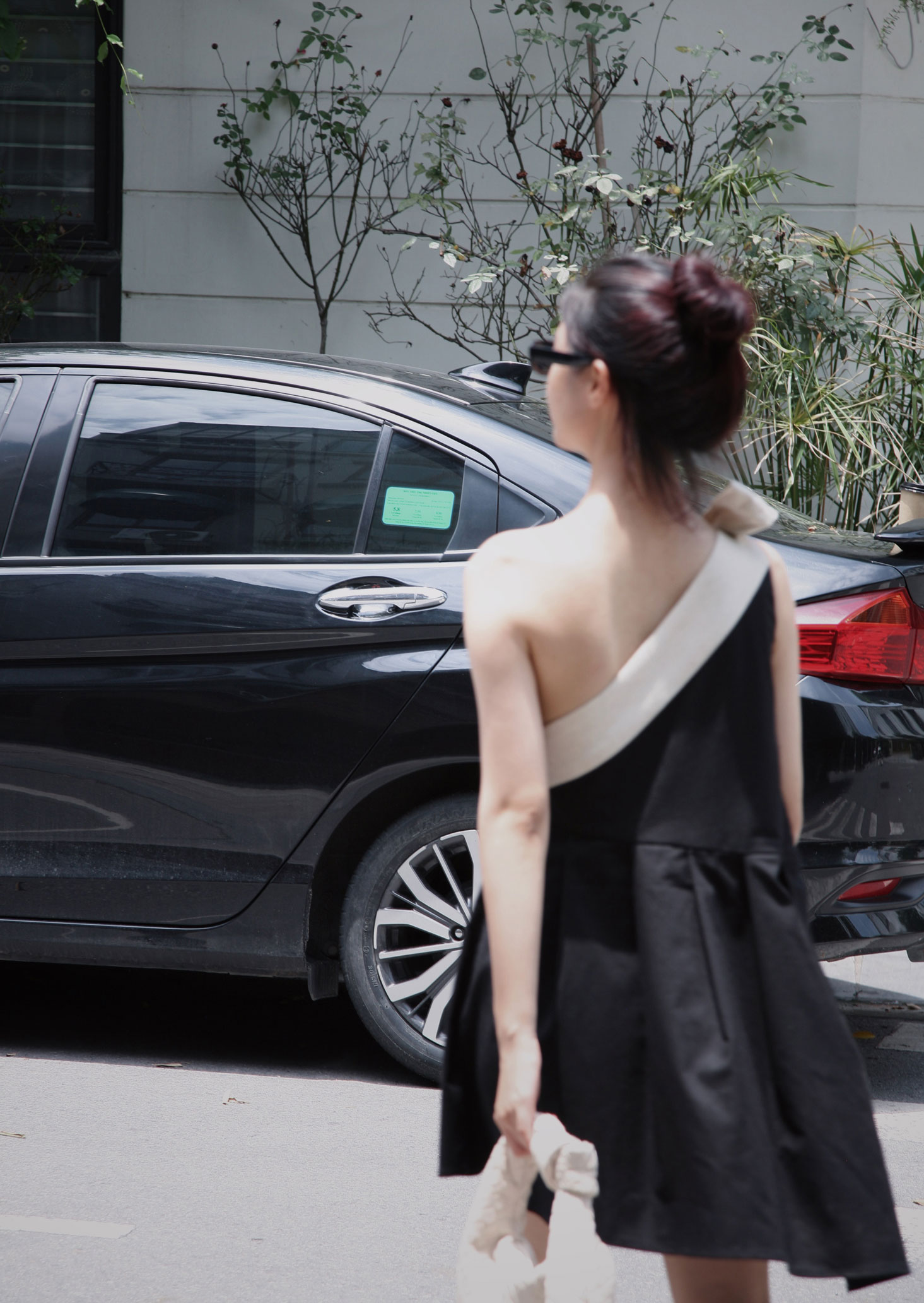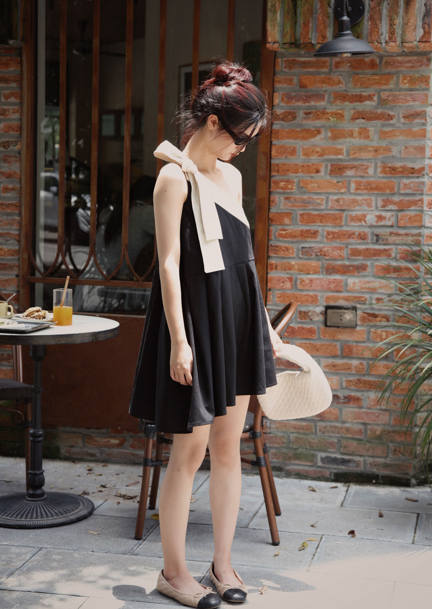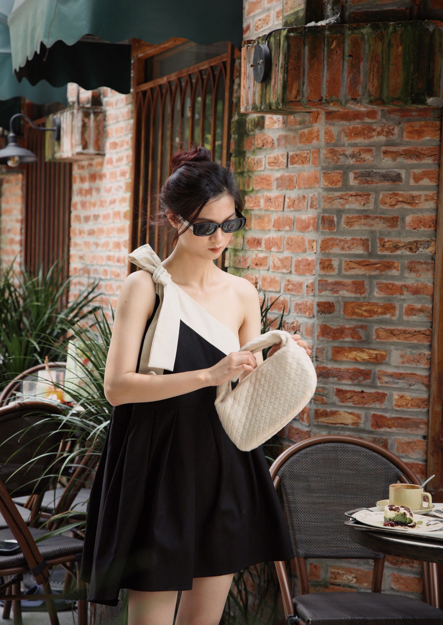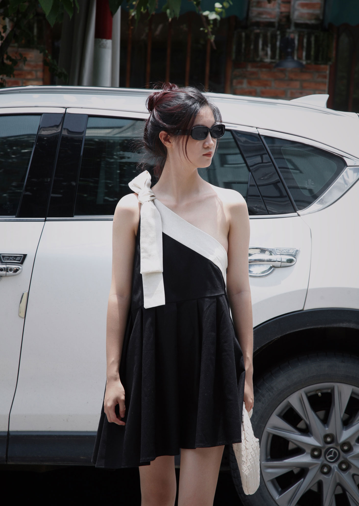 Playful yet polished, this one-shoulder mini dress pairs a sculptural contrast sash with a swingy, flared skirt. The ivory strap sweeps diagonally across a black bodice and ties in a soft knot at the shoulder for a chic, bow-like finish.