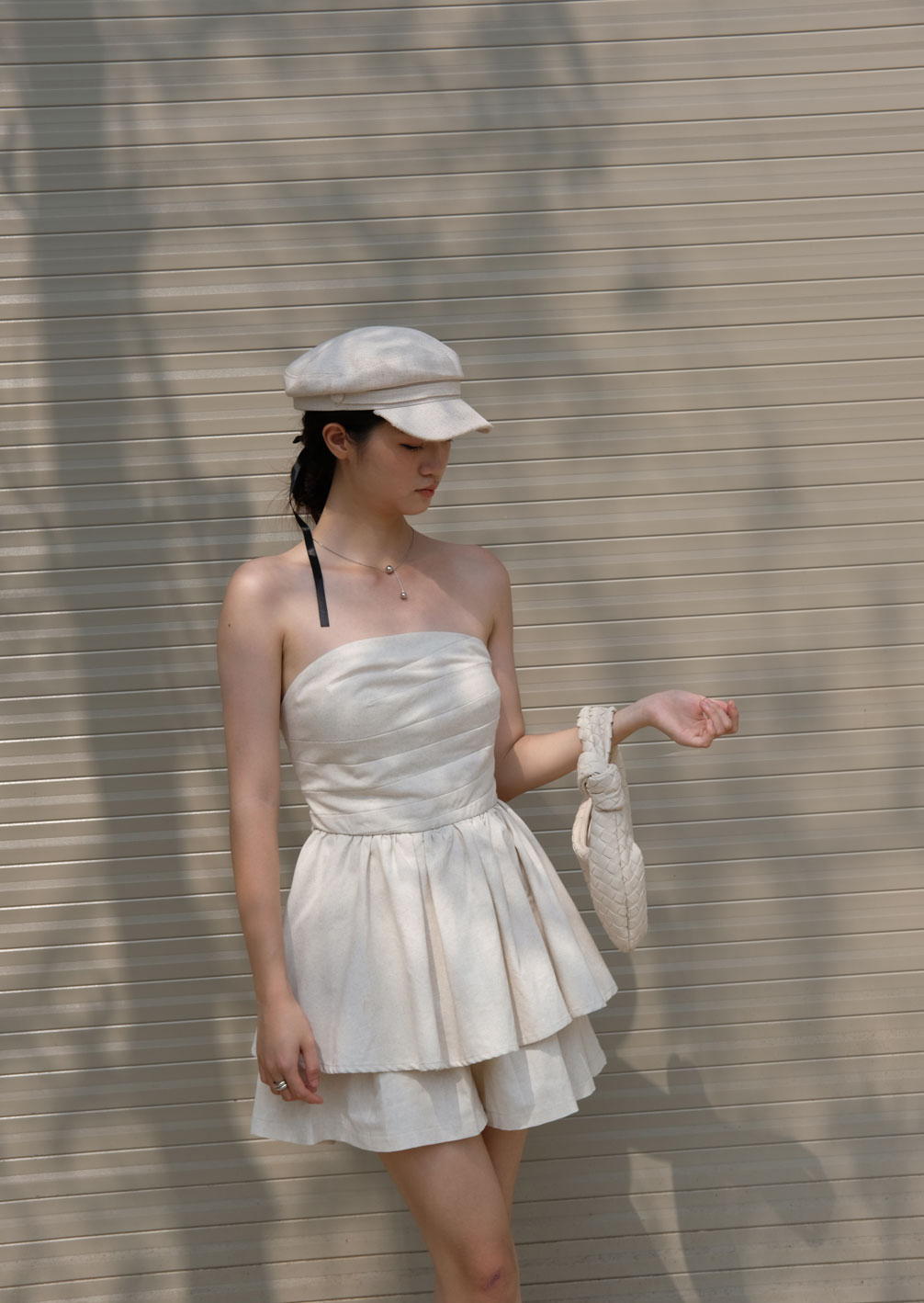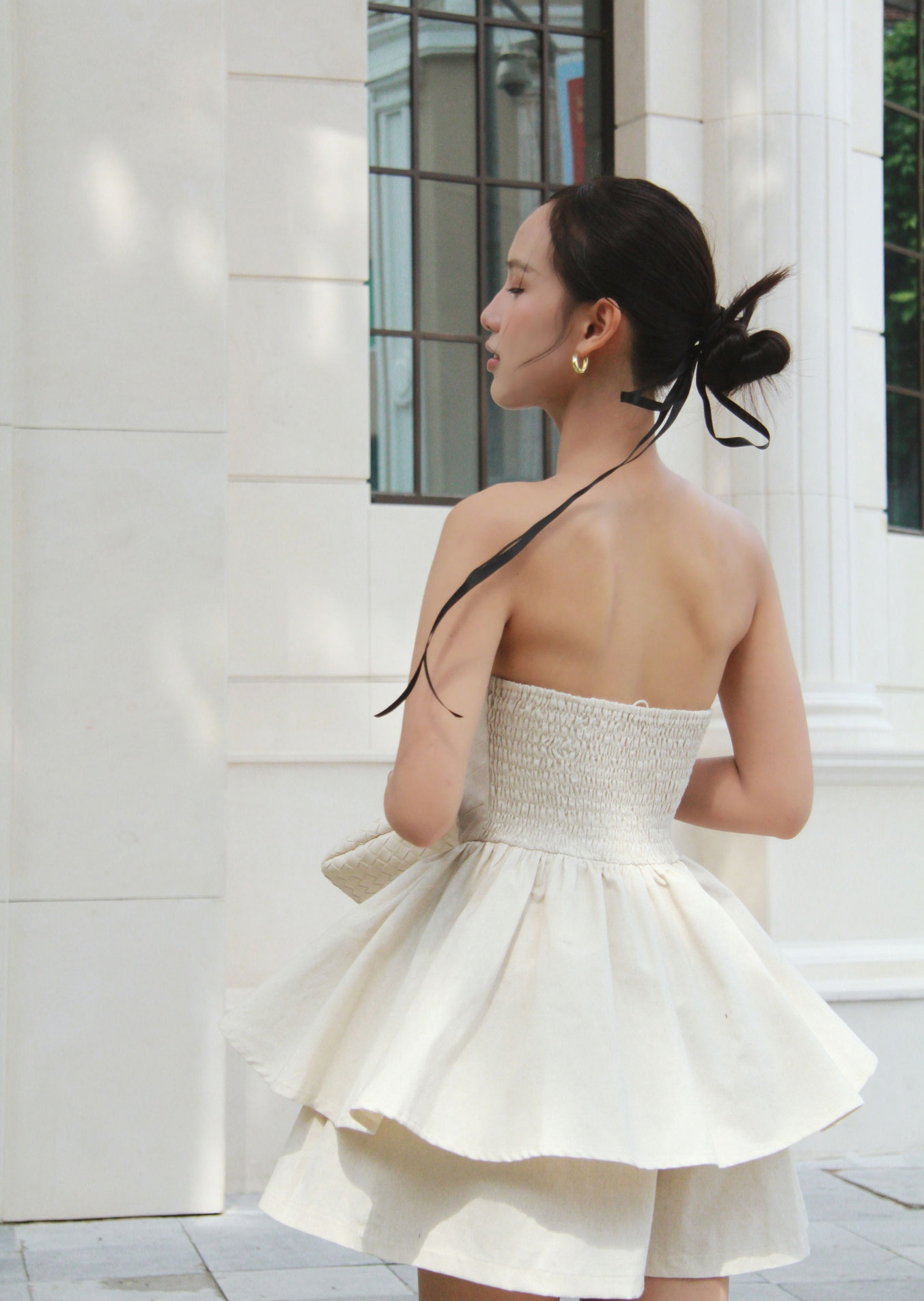 A playful strapless romper with a flirty, two-tier peplum that skims the hips. The bandeau bodice is softly ruched for shape and held in place by a wide smocked back, while the mini shorts peek out beneath the layered hem for a leg-lengthening look. Effortless, feminine, and ready for day-to-night styling.